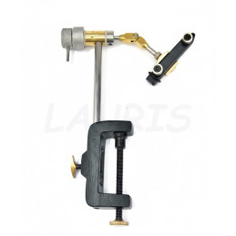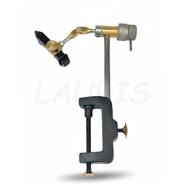 Această menghină reprezintă o variantă mult mai versatilă și articulată, fiind concepută pentru a oferi o libertate de mișcare superioară și o fixare extrem de rigidă pe masa de lucru. -in loc de baza grea (piedestal), acest model folosește o clemă robustă (C-clamp) care se înșurubează direct pe marginea mesei. Acest sistem ocupă mai puțin spațiu pe blatul de lucru și oferă o stabilitate imbatabilă, menghina neputând fi mișcată accidental în timpul tensionării firului. -surubul de prindere are o terminație lată, zimțată, din alamă, pentru o manevrare ușoară. -marea diferență o reprezintă segmentul articulat dintre tijă și capul menghinei. Acesta permite ajustarea unghiului în mai multe planuri, astfel încât poți aduce cârligul exact în poziția ideală pentru ochii tăi, indiferent de înălțimea scaunului. -capul negru dispune de două rotițe zimțate laterale. Această configurație permite o micro-ajustare a presiunii pe cârlig, fiind ideală pentru cârlige de dimensiuni foarte variate. -in partea opusă capului se află două rotițe mari, striate care fac posibila rotația de 360 de grade, permițându-ți să rotești musca foarte fin pentru a verifica simetria sau pentru a aplica materiale pe sub corpul muștei. -deși pare complexă, aceasta menghină este adesea preferata de pescarii care călătoresc, deoarece clema de masă este mai ușoară și mai puțin voluminoasă decât o bază grea de fontă (piedestal). -este ideală dacă ai o masă dedicată pentru hobby și dacă îți place să lucrezi la modele de muște complexe care necesită vizualizarea cârligului din unghiuri neobișnuite.